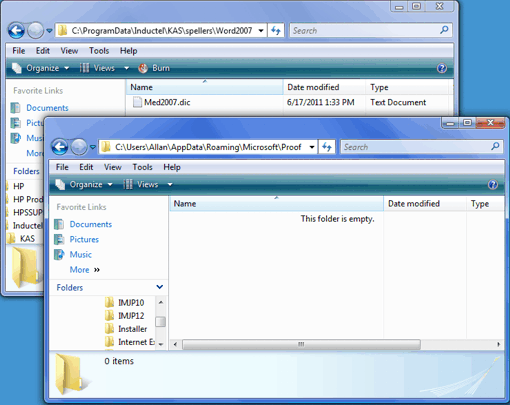 If you have a Windows Vista or a Windows 7 computer, the "Word2007" folder is found at C:\ProgramData\Inductel\KAS\spellers\Word2007. Note: the ProgramData folder may be hidden, so you may have to tell Windows to display hidden files and folders.