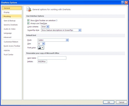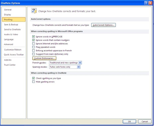 In OneNote Options, click on "Proofing."