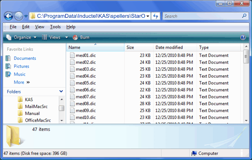 If you have a Windows Vista or a Windows 7 computer, the "StarOffice" folder is found at C:\ProgramData\Inductel\KAS\spellers\StarOffice. Note: the ProgramData folder may be hidden, so you may have to tell Windows to display hidden files and folders.