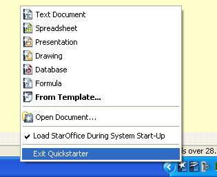After copying the Inductel spelling dictionaries to the "wordbook" folder, but before you activate your Inductel Speller, be sure to exit the "Quickstarter." The Quickstarter icon will be located in the Windows Taskbar. To exit Quickstarter in StarOffice 6.0, right click on the "butterfly icon", and "Exit Quickstarter." In StarOffice 7, 8, or 9, right click on the "star icon" , and "Exit Quickstarter." In OpenOffice, right click on the "flying birds" icon, and "Exit Quickstarter."