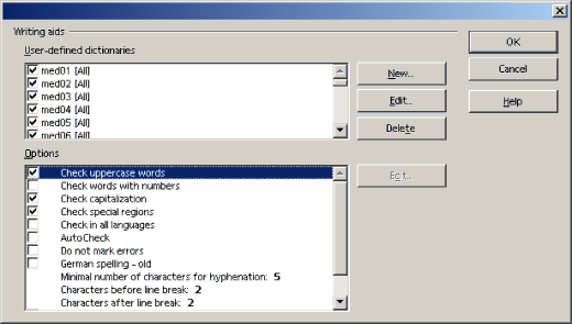 In "Options", place a check mark by each of the "med" user-defined dictionaries. There are 47 of them, named med01 through med47. Check mark them all, and click on "OK." Your Inductel Speller is now active.