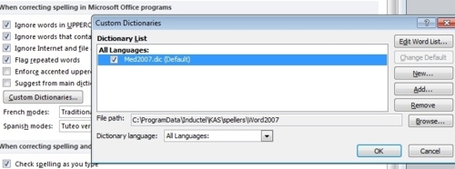 Windows 7 or Windows Vista: In Custom Dictionaries, click the "Add" button, browse to the file path "C:\ProgramData\Inductel\KAS\spellers\Word2007" and add your new custom dictionary. Note: the ProgramData folder may be hidden, so you may have to tell Windows to display hidden files and folders.