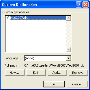 Windows XP: In Custom Dictionaries, click the "Add" button, browse to the file path "C:\Documents and Settings\All Users\Inductel\KAS\spellers\Word2007" and add your new custom dictionary.