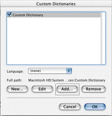 5)  In "Custom Dictionaries", click on "Add..."  Your going to add your Inductel custom dictionary.
