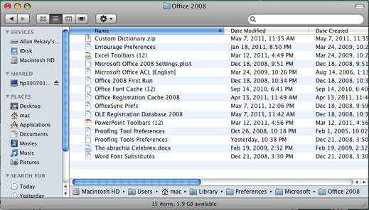 The Office 2008 folder is located at: Macintosh HD\Users\username\Library\Preferences\Microsoft\Office 2008.