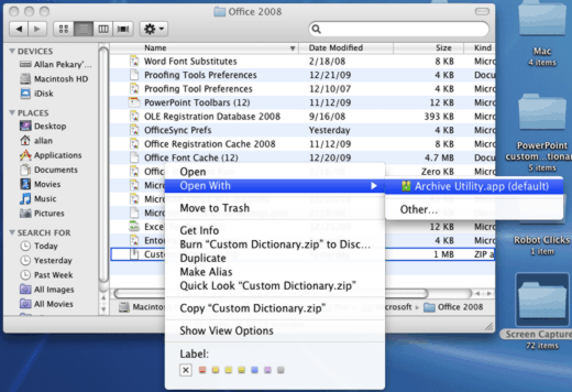 Please remove any existing files named "Custom Dictionary" from the Office 2008 folder because when you unzip your new Inductel file, it will create a new file named "Custom Dictionary" that may overwrite any other "Custom Dictionary." Now, unzip Inductel "Custom Dictionary.zip". Here's how. Right click, or Ctrl click the file, and open with the "Archive Utility."