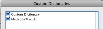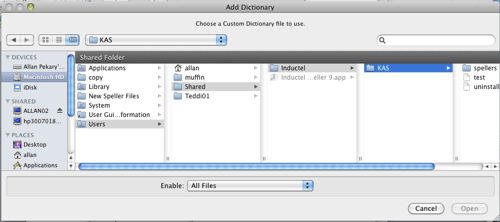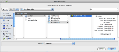 In "Add Dictionary", choose the custom dictionary file  located in the "WordMacXSrc"  folder. The path to that folder  is: Macintosh HD\Users\Shared\Inductel\KAS\spellers\WordMacXSrc.  There, choose your new Inductel custom dictionary. Then, click on the "Open" button.   Below, we chose  "Med2007Mac.dic."      (NOTE: Your Inductel custom dictionary could be named “Combo2007.dic” depending on which Inductel product you have.)