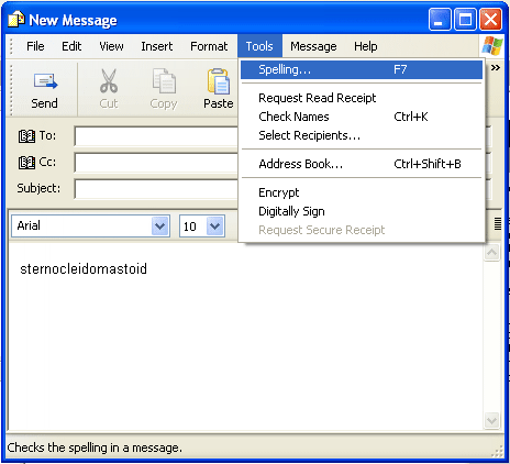 After having copied the file to the Microsoft Shared folder, run Outlook Express and open a document that you wish to spell check. Then, select "Tools", and then "Spelling."