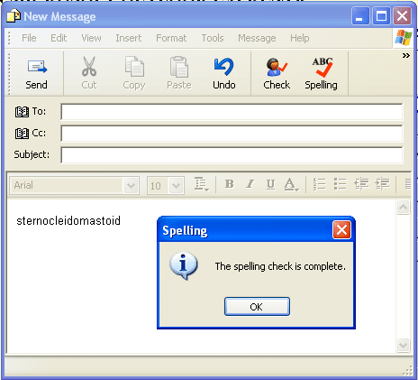 The Outlook Express spell checker will now recognize as correctly spelled all words it encounters in your message that are also in your new Inductel custom dictionary. You may now exit this tutorial, open Microsoft Outlook Express, and actually perform a spell check. Verify that your new speller is working. Key in some test words.