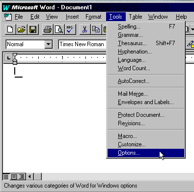 IN MICROSOFT WORD 7/WORD 95 As shown here, run Microsoft Word , and open a document that you wish to spell check. Then, select "Tools", and next select "Options."