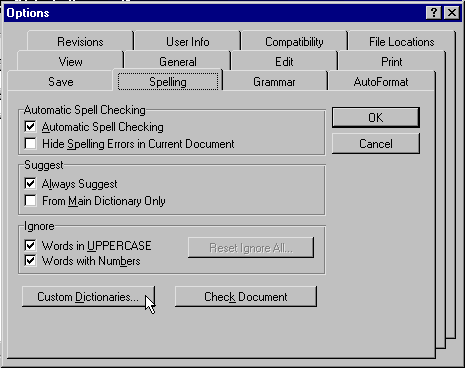 After adding your new custom dictionaries, please put a check by each one you wish to have active during your spell check. Then click on OK to exit "Custom Dictionaries." You are ready to run a spell check. Please note, a maximum of ten custom dictionaries may be active at one time.