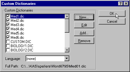 Windows XP: In Custom Dictionaries, click the "Add" button, browse to "C:\Documents and Settings\All Users\Inductel\KAS\spellers\Word6795" and add your new custom dictionary.