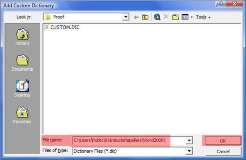 5. Paste the following path into the "File name" box. Then hit the "OK" button. C:\Users\Public\01Inductel\spellers\Word2000\