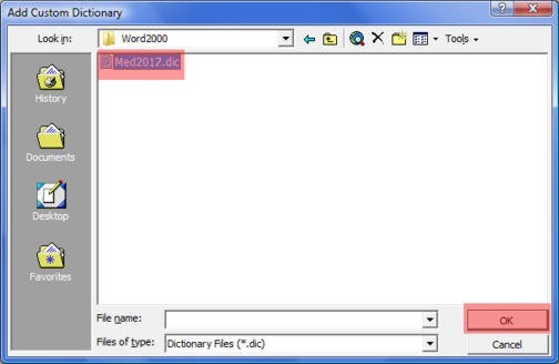 6. From the "Word2000" folder, select the Inductel custom dictionary or dictionaries, depending on which product you have, and hit "OK."