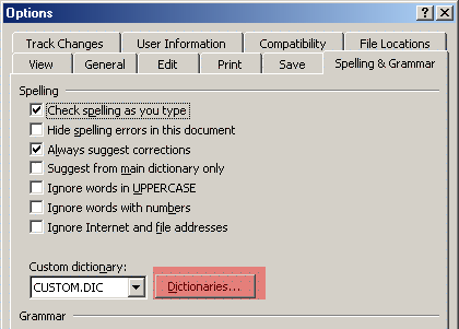 3. Put a check mark by "Always suggest corrections." Remove any check mark from "Suggest from main dictionary only." Remove any check marks from the "Hide spelling errors in this document." Then, click on the "Dictionaries" button.