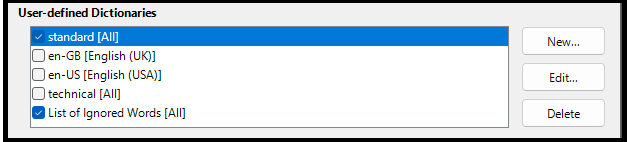 5. ENABLE YOUR NEW CUSTOM DICTIONARY. Open LibreOffice and navigate to: Tools > Options > Languages and Locales > Writing Aids. There, in User-defined Dictionaries, place a check mark on standard [All] .