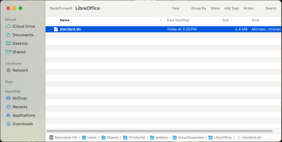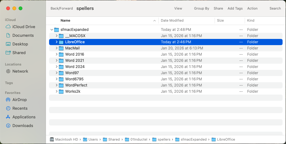 2. SOURCE FOLDER is located on your MAC at Macintosh HD > Users > Shared > 01Inductel > spellers > sfmacExpanded > LibreOffice. Open that LibreOffice folder, and you will see your new custom dictionary.