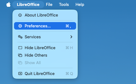 5. Having restarted your Mac, ENABLE YOUR NEW CUSTOM DICTIONARY. Here's how: Start LibreOffice, and open LibreOffice Preferences.