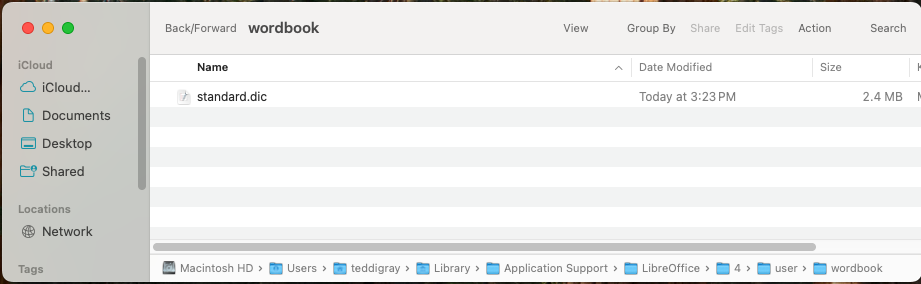 3. DESTINATION FOLDER: Its name is "wordbook", and it's located at Macintosh HD > Users > "your username here" > Library > Application Support > LibreOffice > 4 > User > wordbook