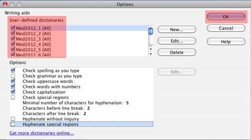 In "Options", place a check mark by each of the "Med2017" user-defined dictionaries. There are 6 of them. When spell checking small documents, you can probably have all six Inductel custom dictionaries active simultaneously. On large documents, 800 kb and above, you may have up to 2 dictionaries active simultaneously. Click on "OK."