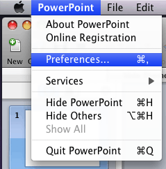 3. Restart your computer. Open a PowerPoint presentation. In the PowerPoint menu, select "Preferences."