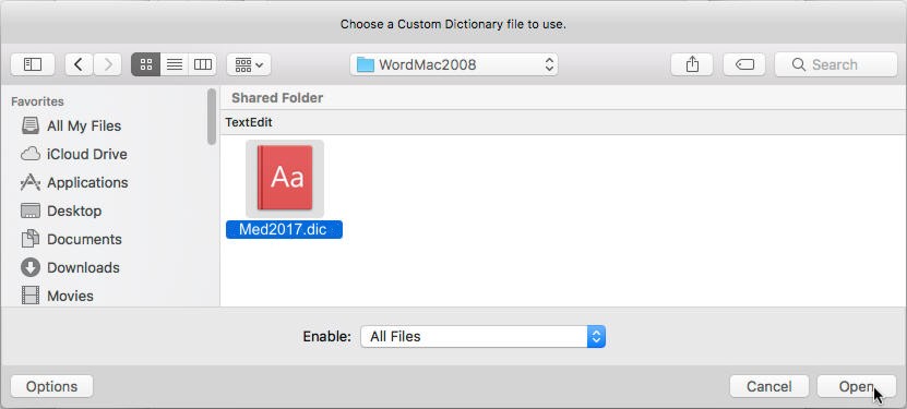 Enable all files, select your Inductel custom dictionary, and then hit the "Open" button.