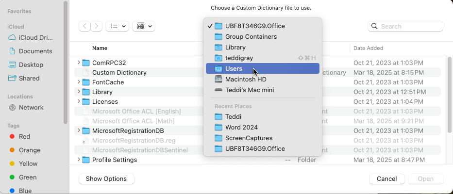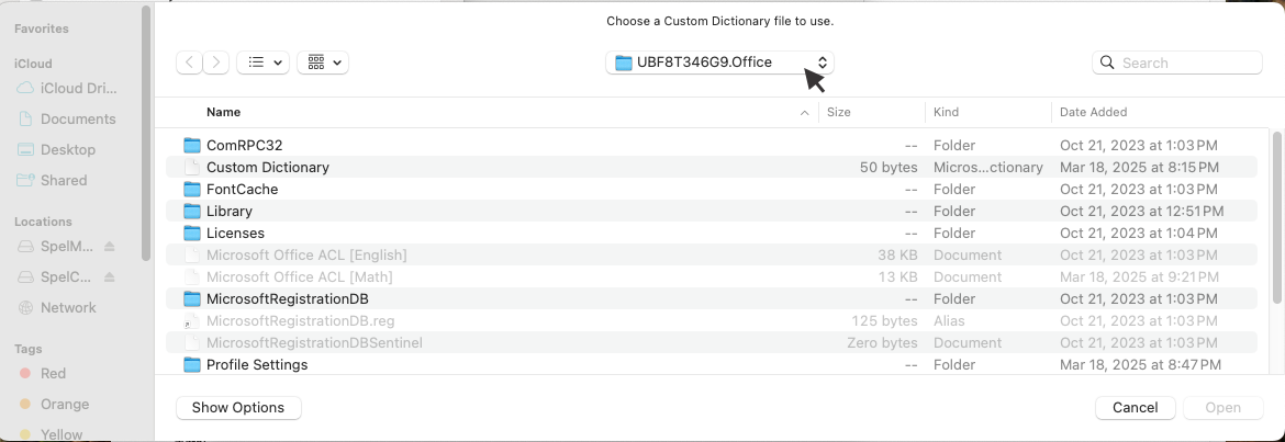 7. Next, browse to the Word 2024 folder along this path: Users/Shared/01Inductel/spellers/sfmacExpanded/Word 2024/SpelMed24.dic (or SpelCombo24.dic). See image immediately below. Some of the folders may be not be visible, for instance 01Inductel. If so, click on the "Shared" folder. 01Inductel will become visible, and so on. Next, in the lower left corner of that same dialog box, please elect to "Show Options" and "Enable All Files(*.*)."