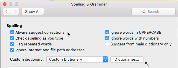 4. In "Spelling and Grammar", place a check by "Always suggest corrections", remove any check from "Suggest from main dictionary only." Then click the Dictionaries" button.