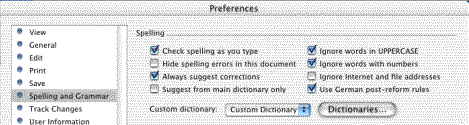 6. In "Spelling", put a check mark by "Always suggest corrections," and remove any check from "Suggest from main dictionary only." Click on the "Dictionaries" button.