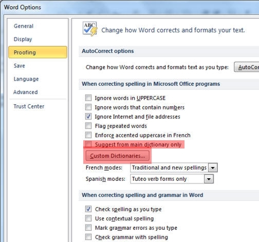 MICROSOFT WORD 2010 1. Open a Microsoft Word Options/Proofing. 2. Remove any checkmark from "Suggest from main dictionary only." Then click on the "Custom Dictionaries" button.