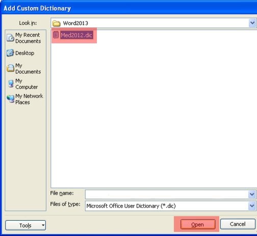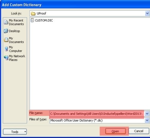 4. Paste the following path into the "File name" box. Then hit the "Open" button. C:\Documents and Settings\All Users\01Inductel\spellers\Word2013\