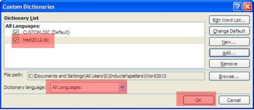 5. Make sure the Inductel custom dictionary is check marked. Make sure the Dictionary language is "All Languages." Now click on the OK button, and return to your document.