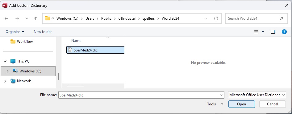 5. In Add Custom Dictionary, navigate from your Users folder to Word 2024. There is your Inductel custom dictionary. It may be named SpelMed24 or SpelCom24. Select it and click on the "Open" button.