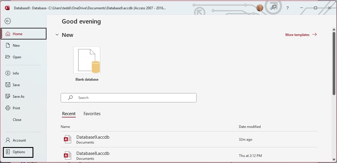 1. Open a new Microsoft Access database, and click on the File tab (upper left corner).
