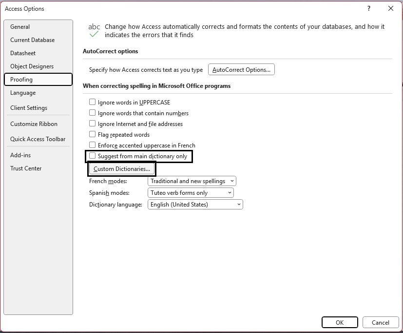 3. In Options, left column, choose Proofing. Then remove any checkmark from "Suggest from main dictionary only box". Then click on the "Custom Dictionaries" button .