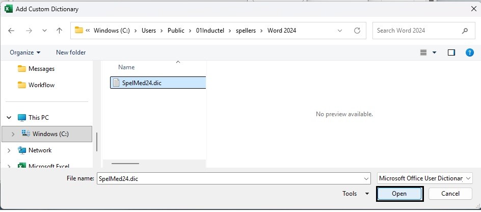 4. Navigate from your Users folder to Word 2024. There is your Inductel custom dictionary. It may be named SpelMed24 or SpelCom24. Select it and click on the "Open" button.
