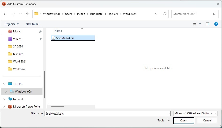4. Navigate from your Users folder to Word 2024. There is your Inductel custom dictionary. It may be named SpelMed24 or SpelCom24. Select it and click on the "Open" button.