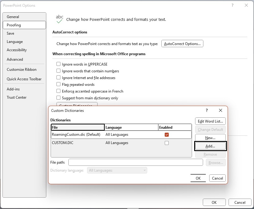 3. In Custom Dictionaries, click on Add.