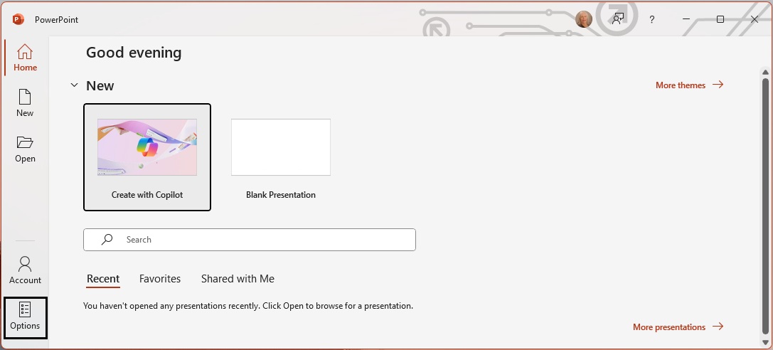 1. Open PowerPoint in full screen mode. Then, from the bottom left part of that PowerPoint window, open PowerPoint Options.