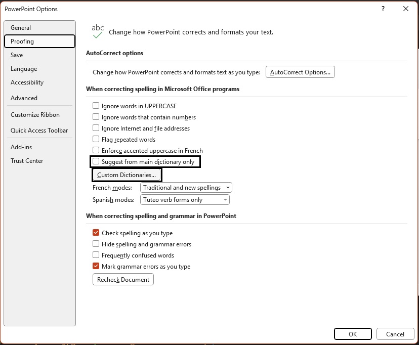 2. In Options, select Proofing then remove any checkmark from "Suggest from main dictionary only." Then click on the "Custom Dictionaries" button.
