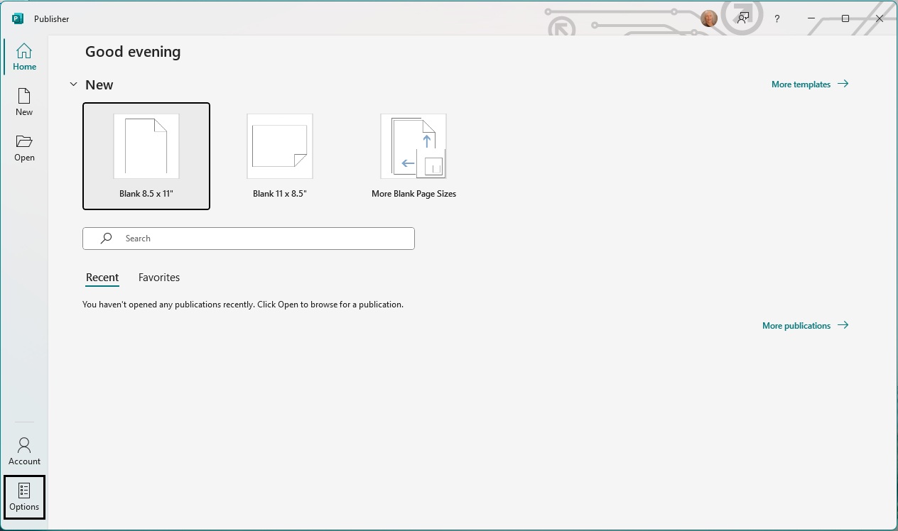 1. Open Publisher in full screen mode. Then, in the lower left corner of your Publisher window, click on Options.