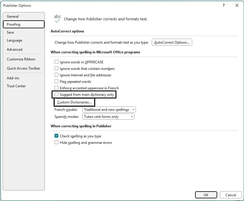 2. In Options, select Proofing then remove any checkmark from "Suggest from main dictionary only." Then click on the "Custom Dictionaries" button.