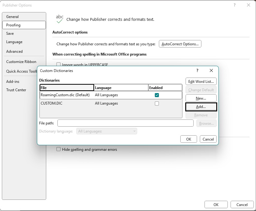 3. In Custom Dictionaries, click on Add.