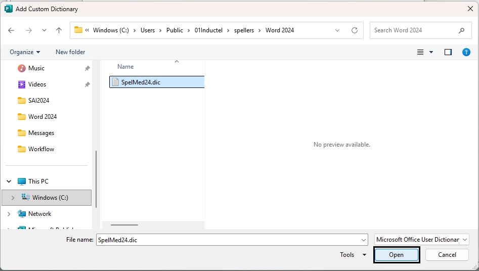 4. In Add Custom Dictionary, navigate from Users to Word 2024. There is your Inductel custom dictionary. It may be named SpelMed24 or SpelCom24. Select it and click on the "Open" button.