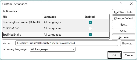5. Success. Make sure the Inductel custom dictionary is check marked. Make sure the Dictionary language is "All Languages". Now, click on the OK button, and return to your document.
