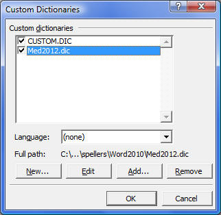 After adding your new custom dictionary, put a check by each one you wish to have active during your spell check. Then click on OK to exit "Custom Dictionaries." You are ready to run a spell check. Please note, a maximum of ten custom dictionaries may be active at one time.