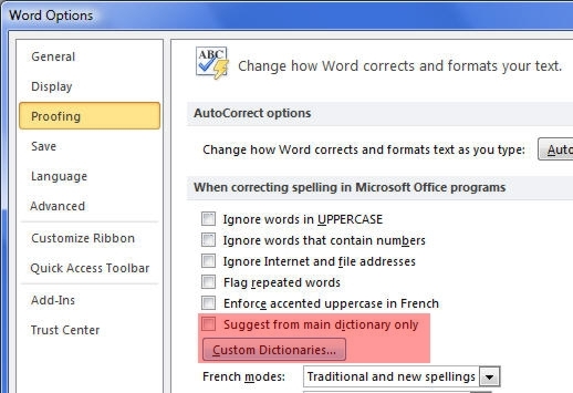 4. Set your Word options: First, open "Proofing." Next, remove any checkmark from "Suggest from main dictionary only." Then click on the "Custom Dictionaries" button.