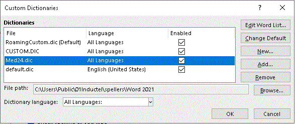 The custom dictionary will either be named "Med24.dic" or "Combo2017.dic" depending on which Inductel product you have. 5. Make sure the Inductel custom dictionary is check marked. Make sure the Dictionary language is "All Languages." Now click on the OK button, and return to your document.